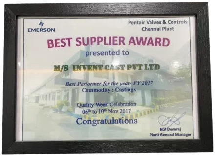 Best supplier award by Pentair Valves & Controls, Chennai Plant in 2017.